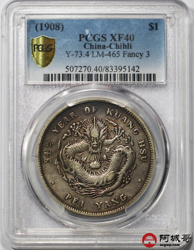Lot:25 北洋34光绪七钱二分小卷三 老包浆 PCGS XF40