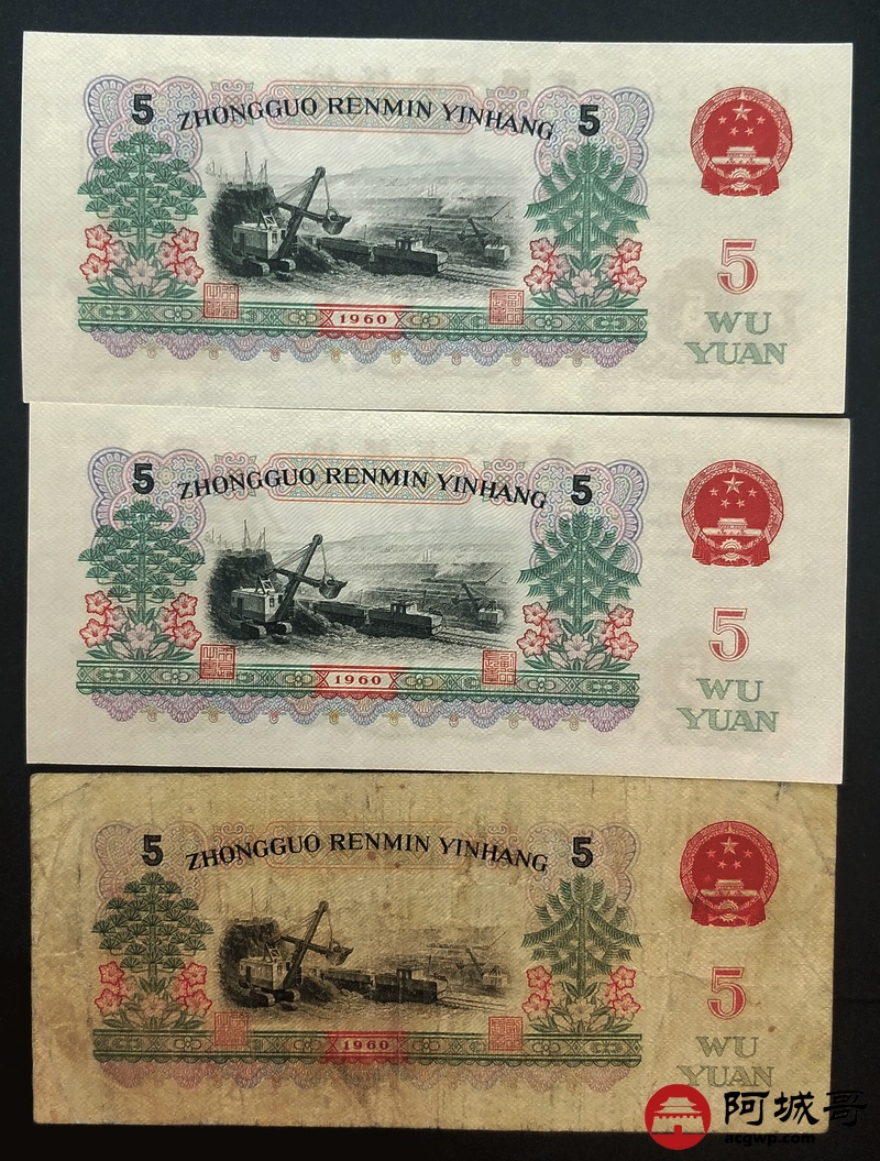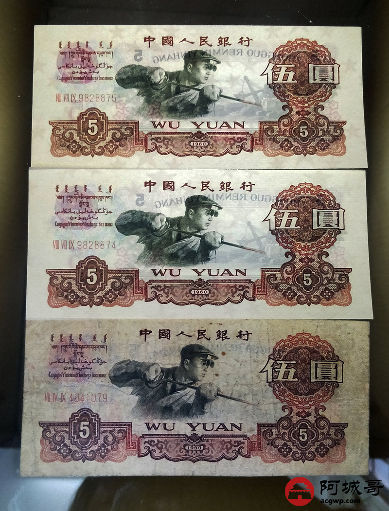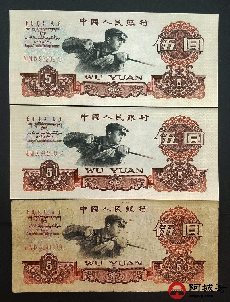 Lot:56 三版人民币 1960年 五圆炼钢工人 中国人民银行 3张75至95成新