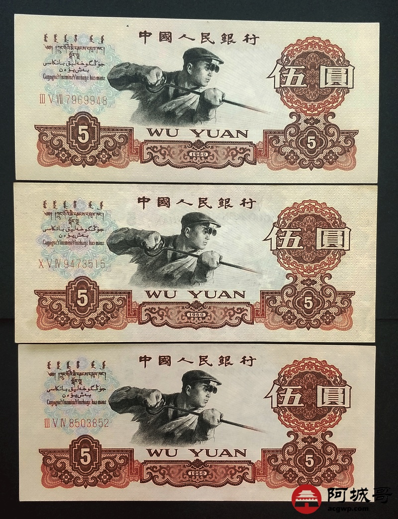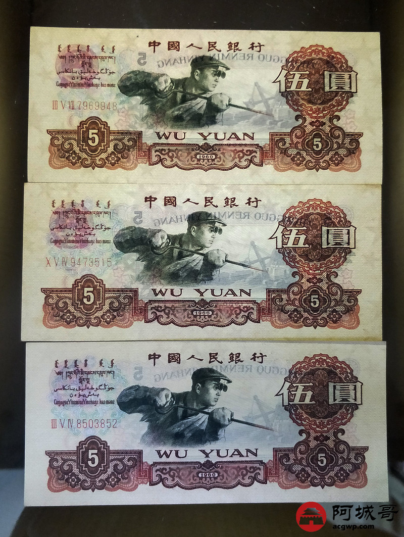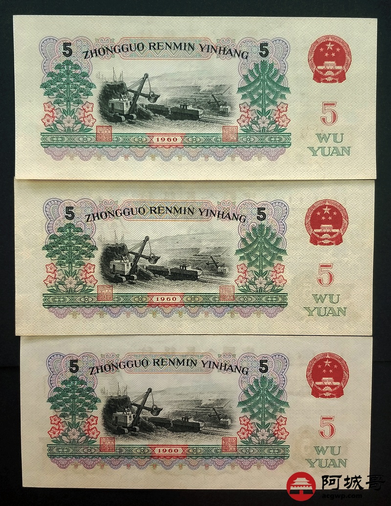 Lot:10 三版人民币 1960年 五圆炼钢工人 中国人民银行 3张 炭黑 原票 88至94成新