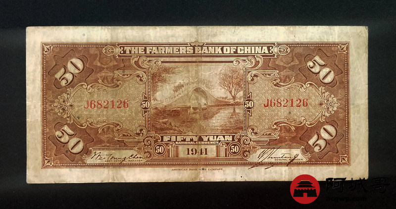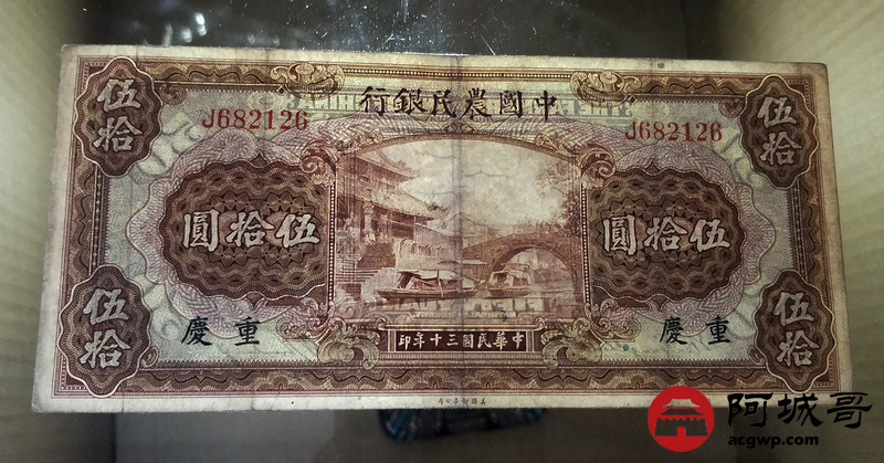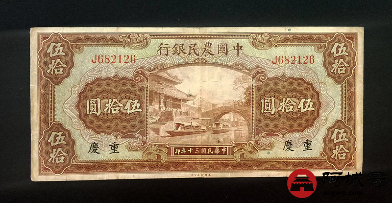 Lot:48 中华民国三十年 伍拾圆 中国农民银行 ( 加盖重庆版稀少八成新)