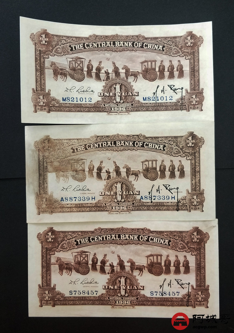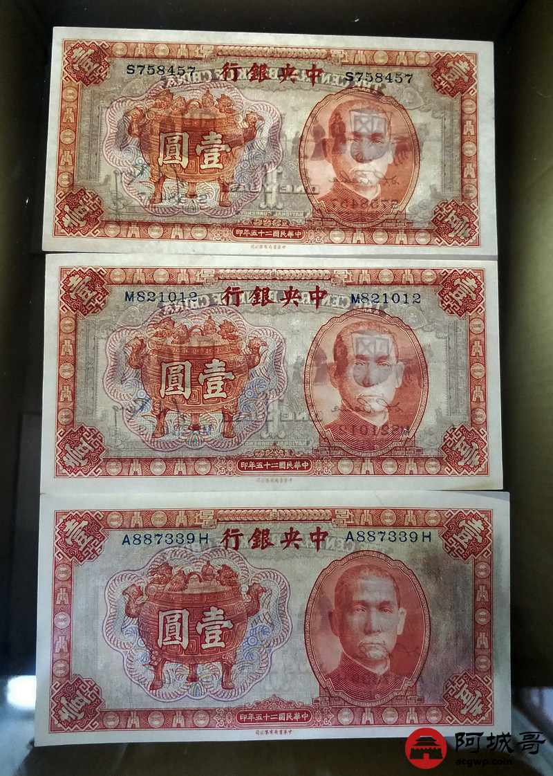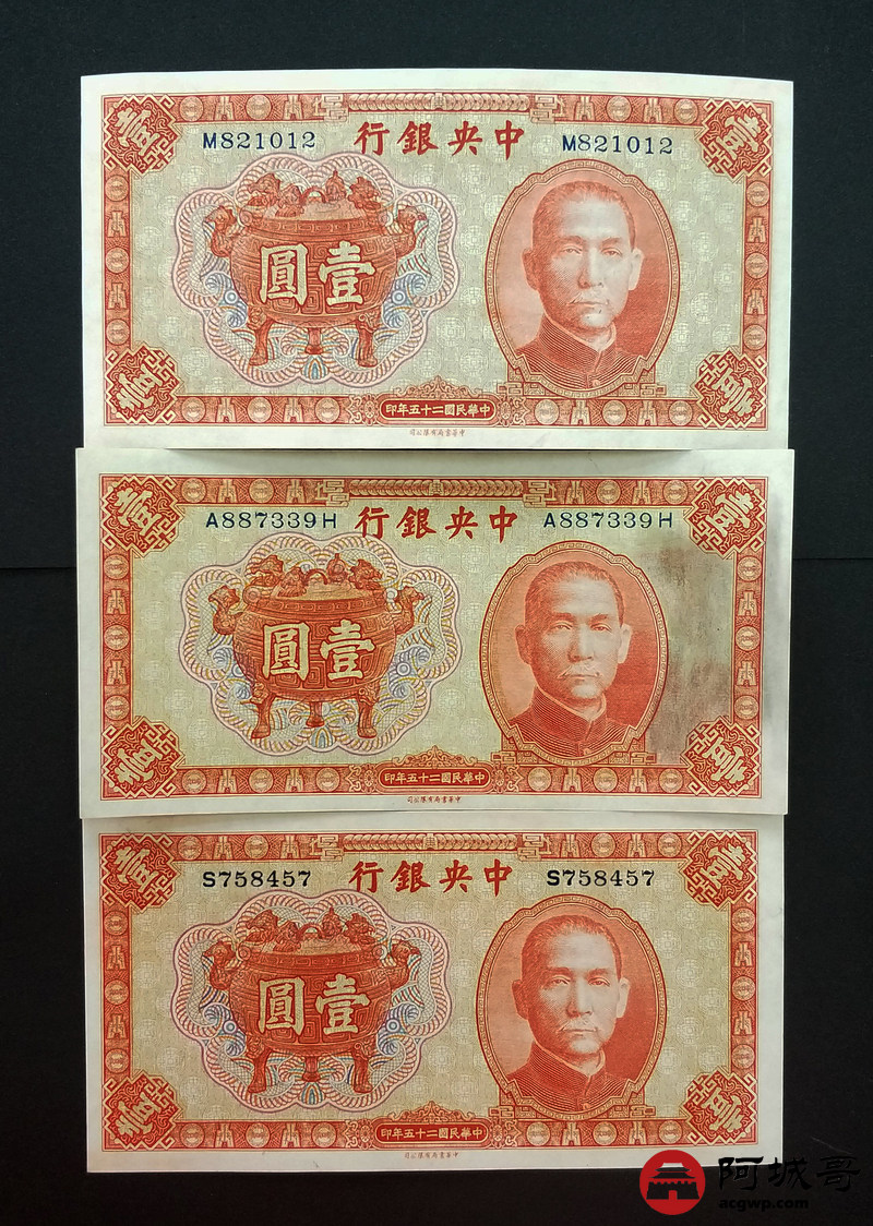 Lot:71 中华民国二十五年 壹圆 中央银行 中央书局有限公司 宝鼎 原票(尾4579成新,其他2张98至全新)