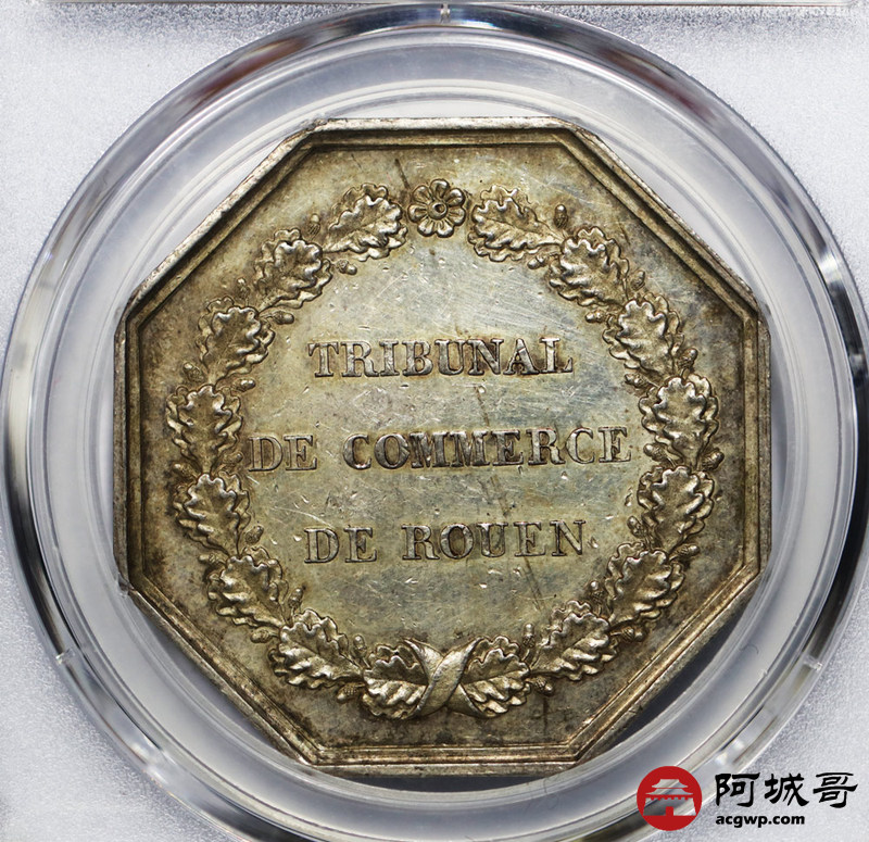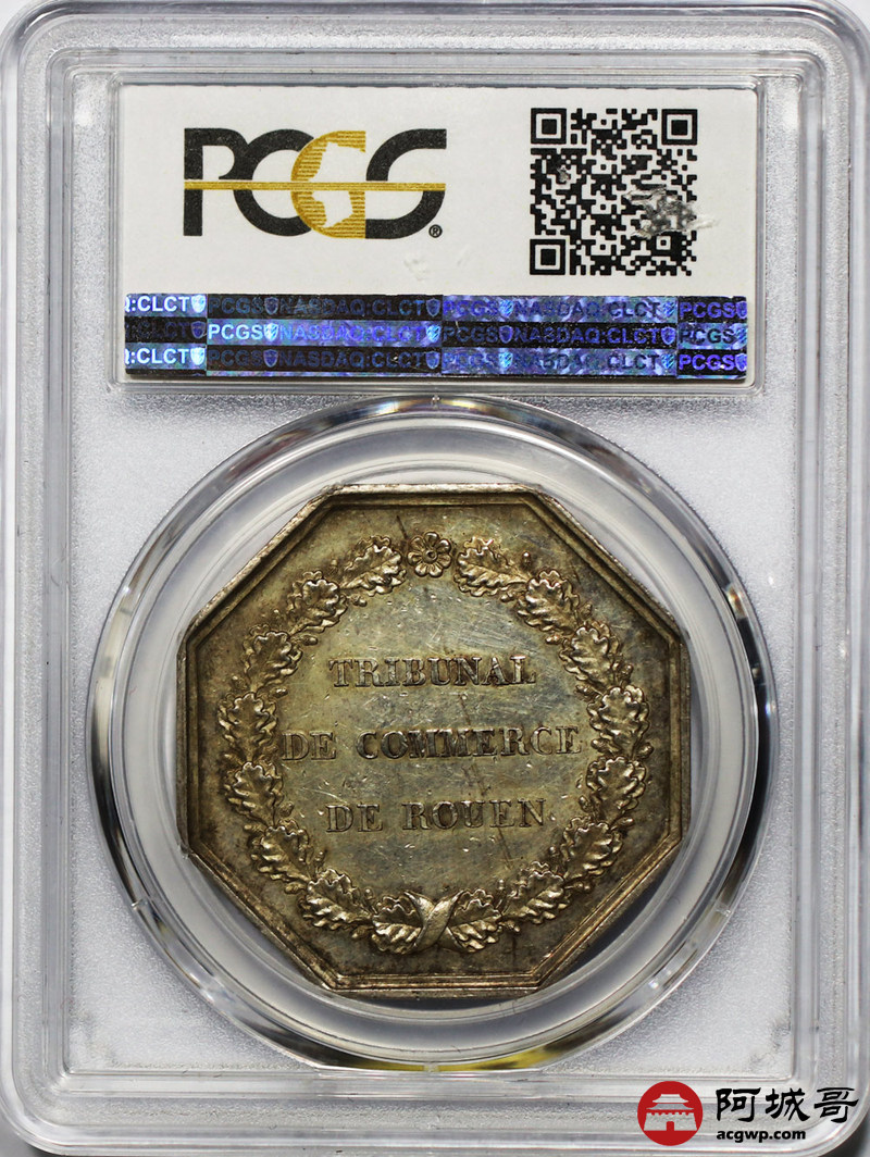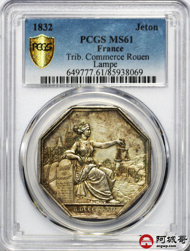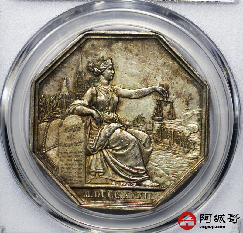 Lot:43 1832年 法国自由女神天平坐像鲁昂商业博览会八角形银章 罕见品种 PCGS MS61