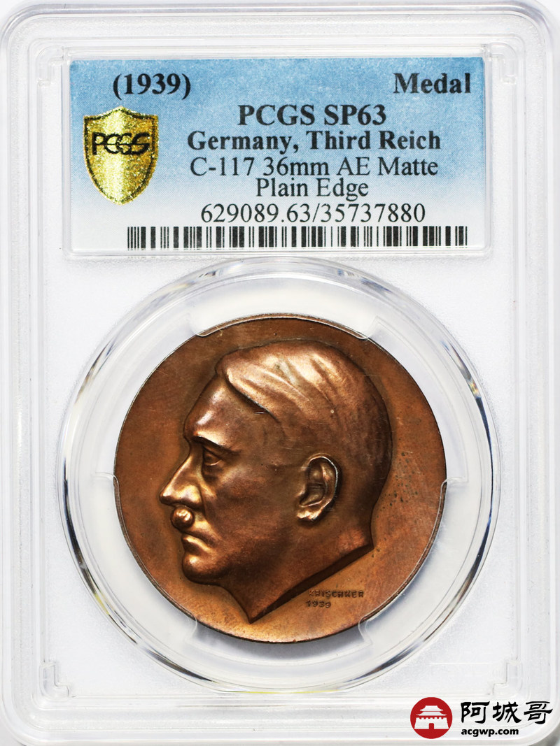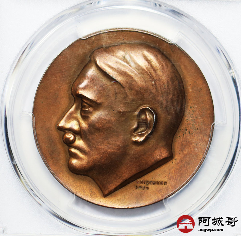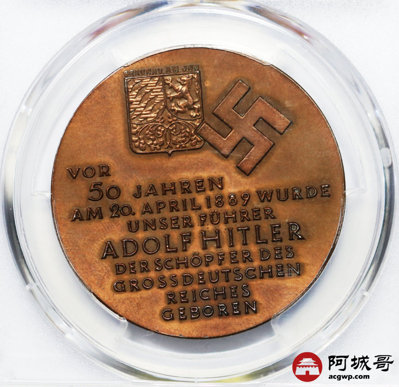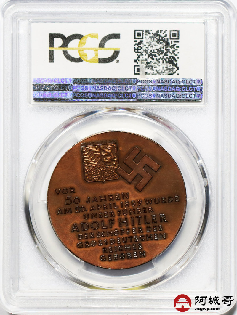 Lot:45 二战纳粹元首希特勒50岁生日纪念铜章 十分少见 PCGS SP63
