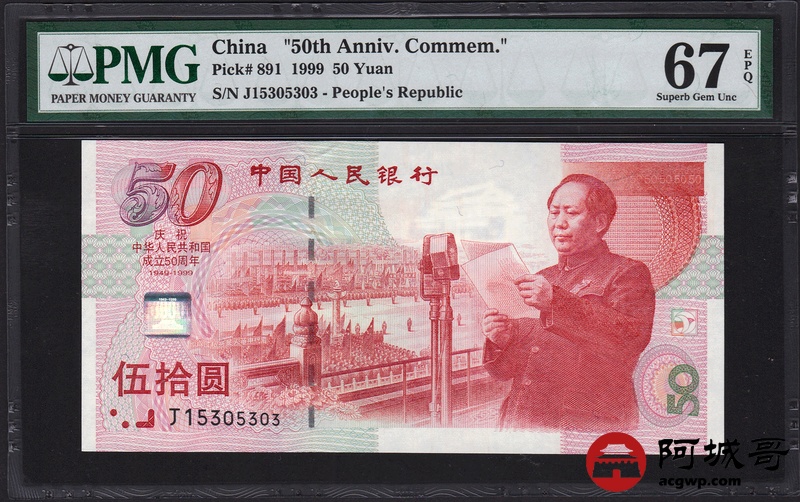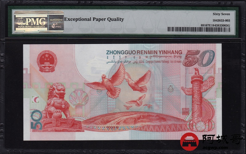 Lot:3 1999年 伍拾圆建国钞 中国人民银行 PMG 67 EPQ 好号无47