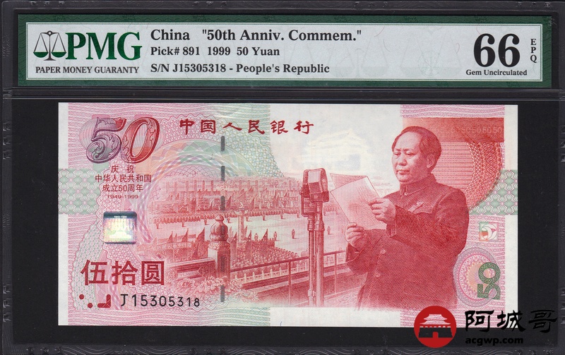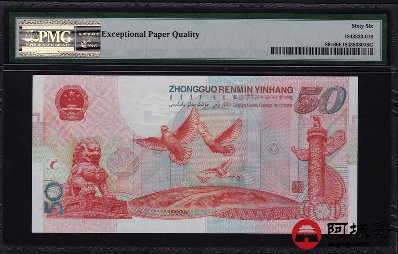 Lot:18 1999年 伍拾圆建国钞 中国人民银行 PMG 66 EPQ 好号无47 尾号8