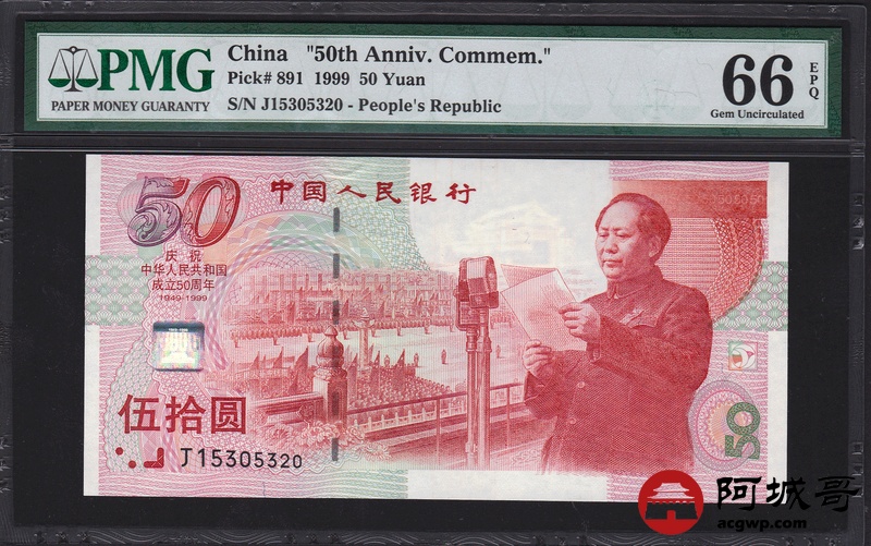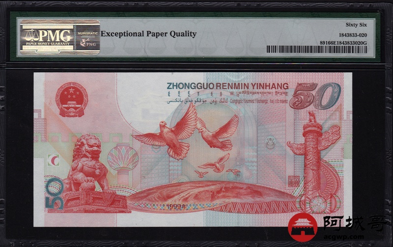 Lot:20 1999年 伍拾圆建国钞 中国人民银行 PMG 66 EPQ 好号无47