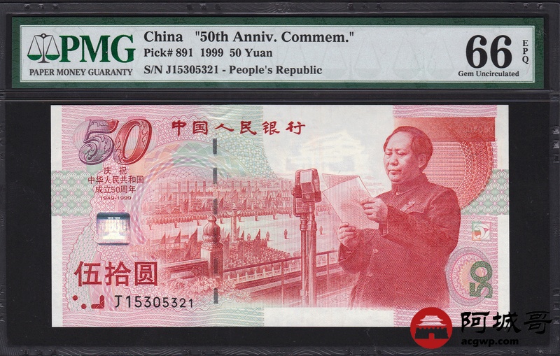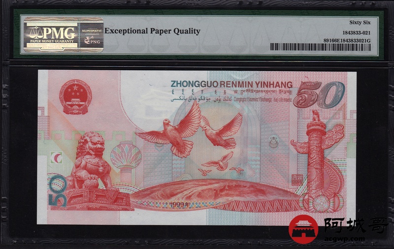 Lot:21 1999年 伍拾圆建国钞 中国人民银行 PMG 66 EPQ 好号无47