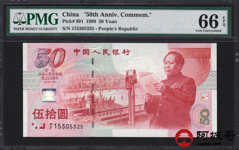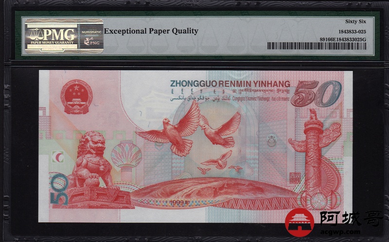 Lot:25 1999年 伍拾圆建国钞 中国人民银行 PMG 66 EPQ 好号无47