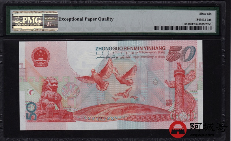 Lot:26 1999年 伍拾圆建国钞 中国人民银行 PMG 66 EPQ 好号无47