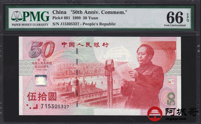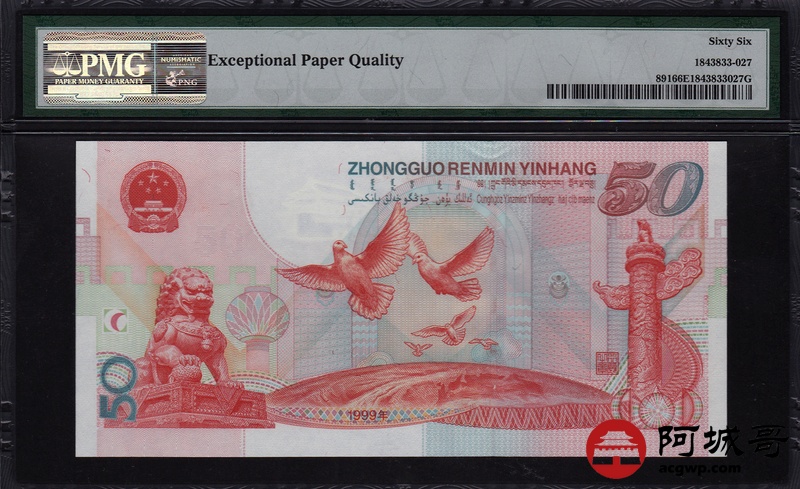 Lot:27 1999年 伍拾圆建国钞 中国人民银行 PMG 66 EPQ 好号无4