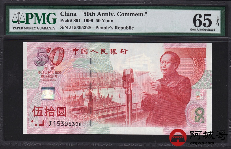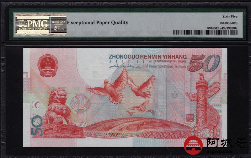Lot:28 1999年 伍拾圆建国钞 中国人民银行 PMG 66 EPQ 好号无47 尾号8