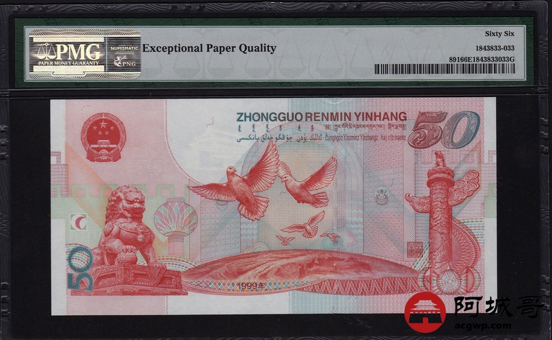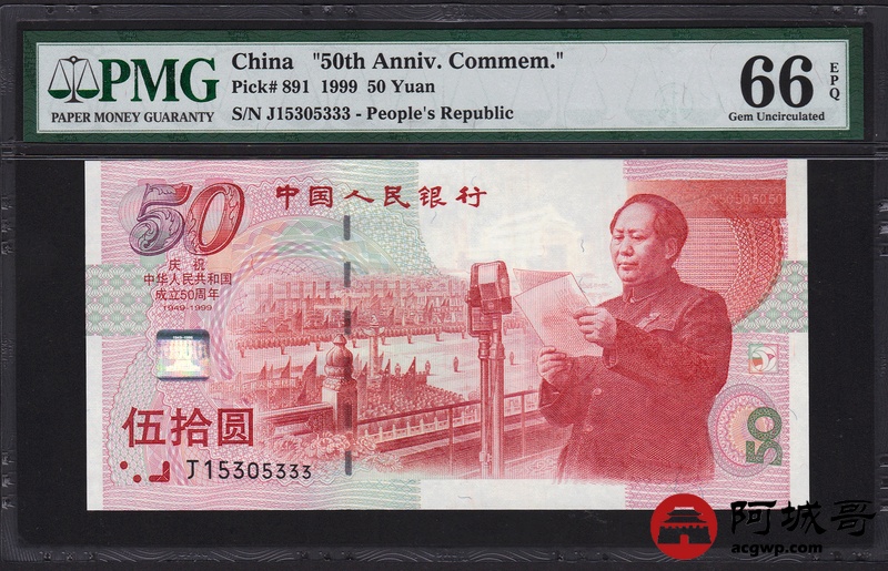 Lot:33 1999年 伍拾圆建国钞 中国人民银行 PMG 66 EPQ 好号无47 尾号豹子号333