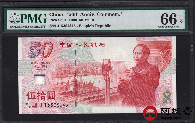 Lot:45 1999年 伍拾圆建国钞 中国人民银行 PMG 66 EPQ 尾号顺子号345