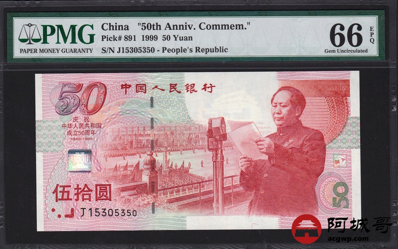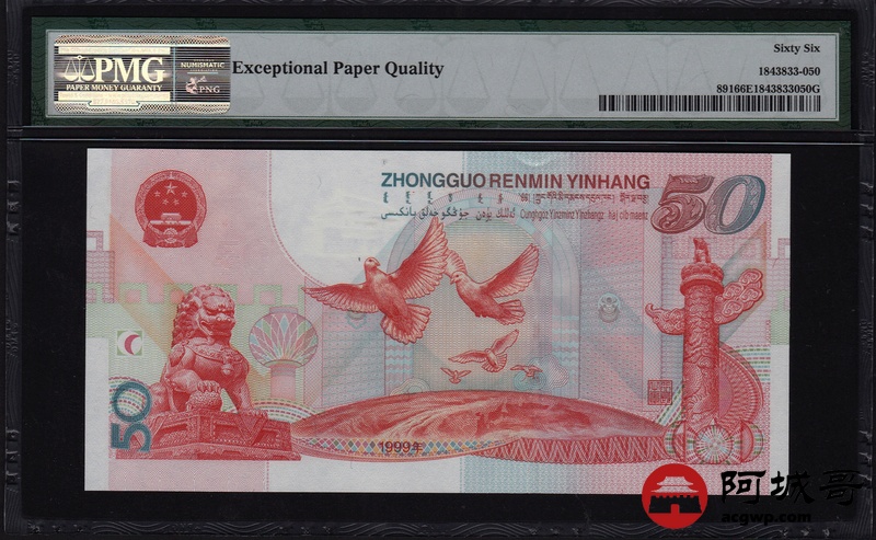 Lot:50 1999年 伍拾圆建国钞 中国人民银行 PMG 66 EPQ 好号无47