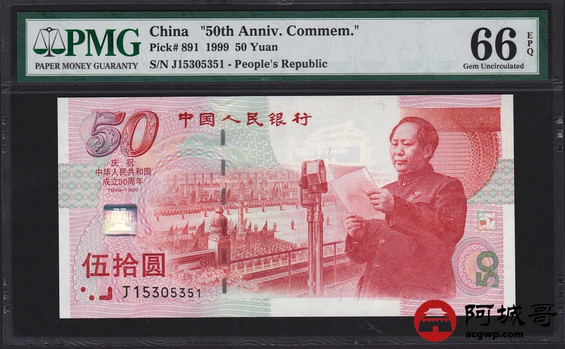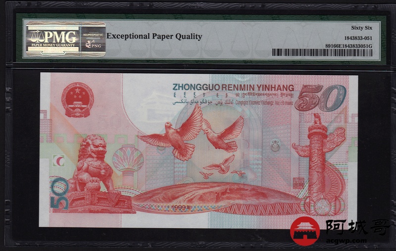 Lot:51 1999年 伍拾圆建国钞 中国人民银行 PMG 66 EPQ 好号无47