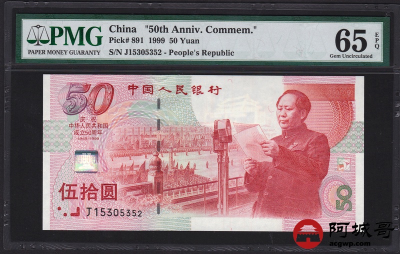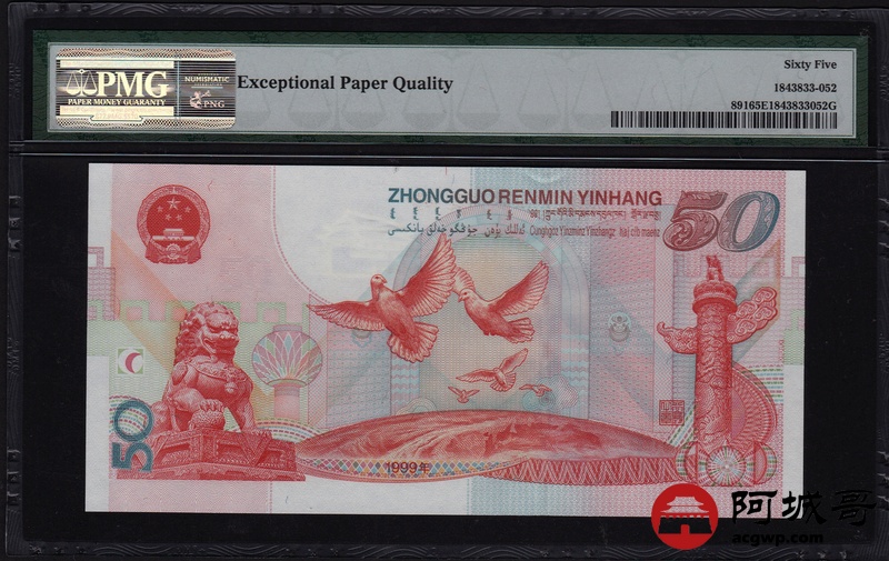 Lot:52 1999年 伍拾圆建国钞 中国人民银行 PMG 65 EPQ 好号无47