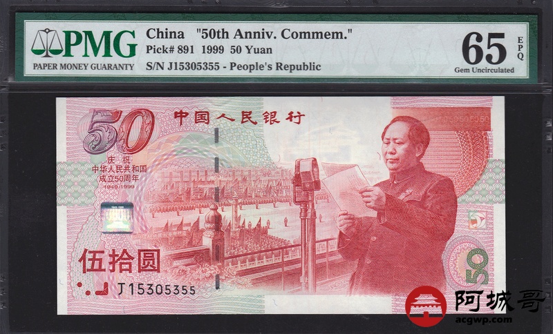 Lot:55 1999年 伍拾圆建国钞 中国人民银行 PMG 65 EPQ 好号无47