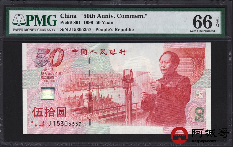 Lot:57 1999年 伍拾圆建国钞 中国人民银行 PMG 66 EPQ 好号无4