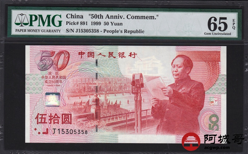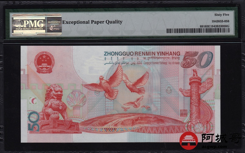 Lot:58 1999年 伍拾圆建国钞 中国人民银行 PMG 65 EPQ 好号无47 尾号58
