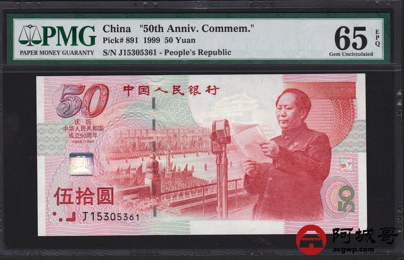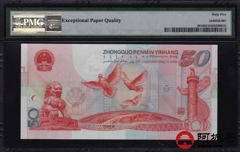 Lot:61 1999年 伍拾圆建国钞 中国人民银行 PMG 65 EPQ 好号无47