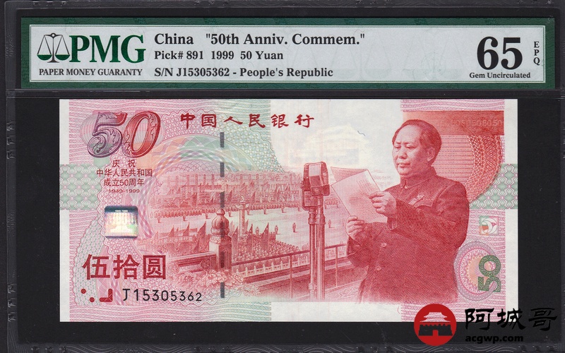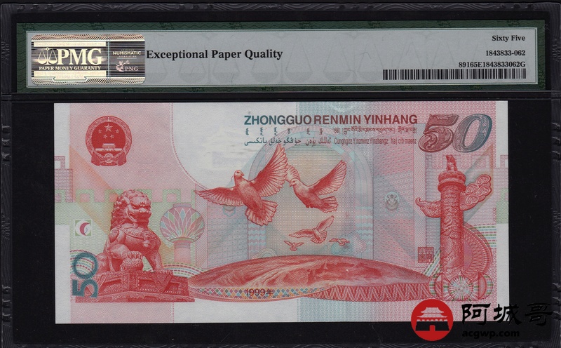 Lot:62 1999年 伍拾圆建国钞 中国人民银行 PMG 65 EPQ 好号无47