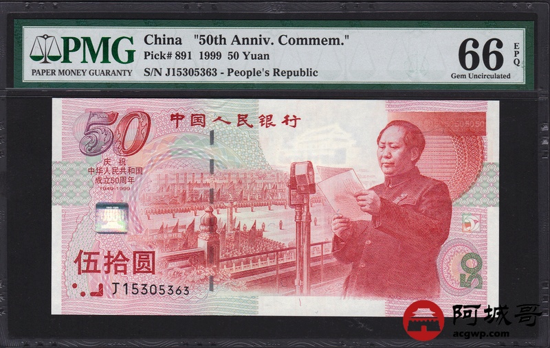 Lot:63 1999年 伍拾圆建国钞 中国人民银行 PMG 66 EPQ 好号无47