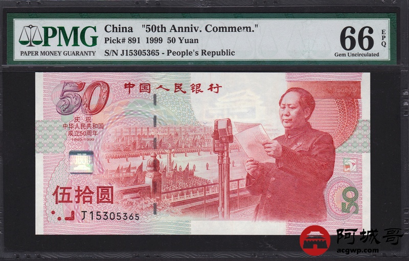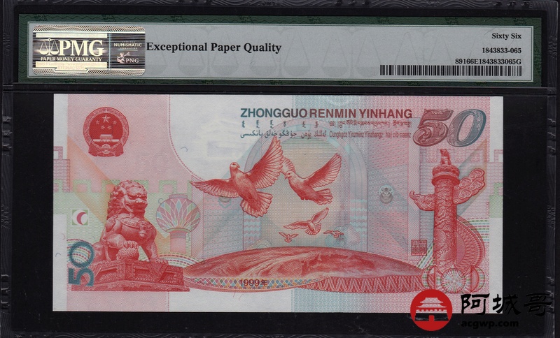 Lot:65 1999年 伍拾圆建国钞 中国人民银行 PMG 66 EPQ 好号无47