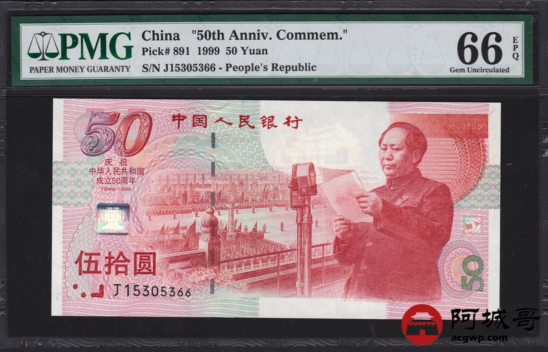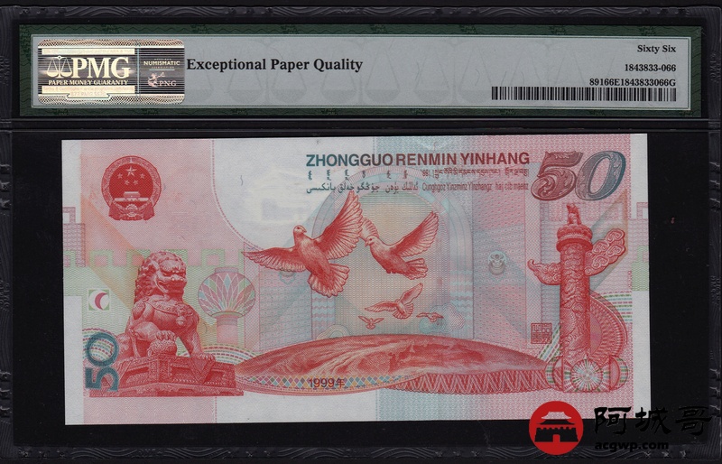Lot:66 1999年 伍拾圆建国钞 中国人民银行 PMG 66 EPQ 好号无47 尾号66