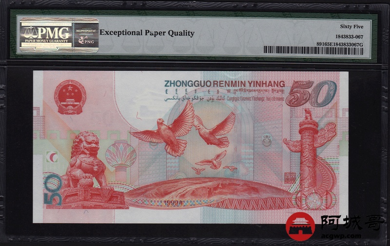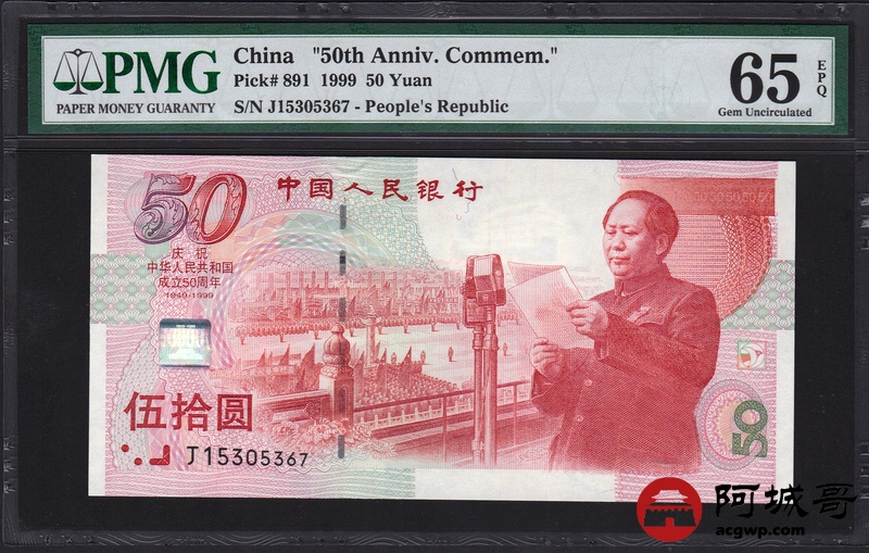 Lot:67 1999年 伍拾圆建国钞 中国人民银行 PMG 65EPQ 好号无4