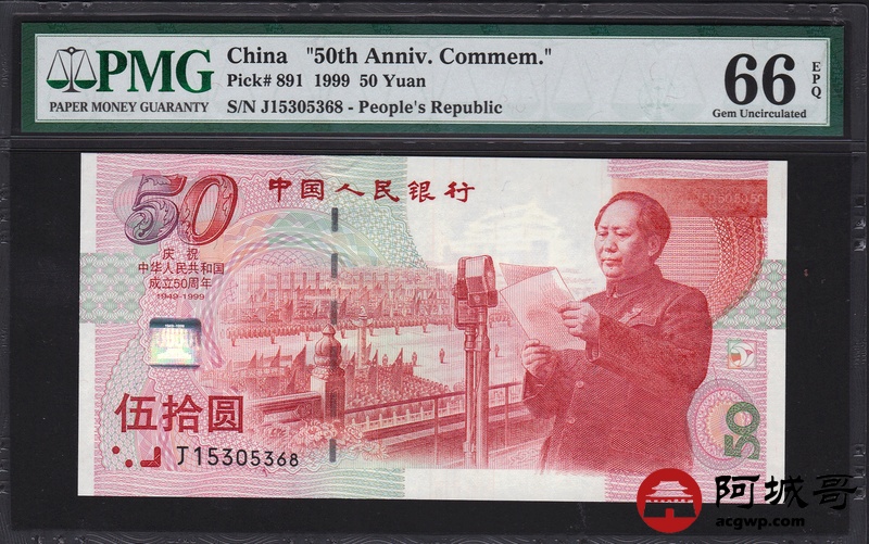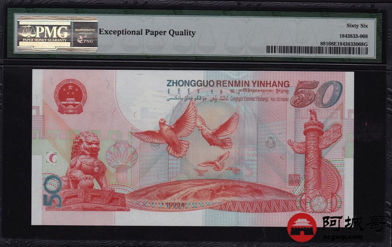 Lot:68 1999年 伍拾圆建国钞 中国人民银行 PMG 66 EPQ 好号无47 尾号68