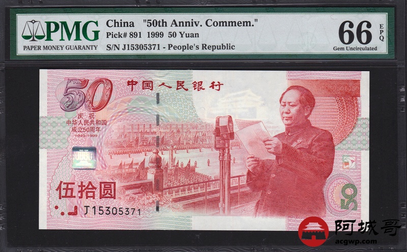 Lot:71 1999年 伍拾圆建国钞 中国人民银行 PMG 66 EPQ 好号无4