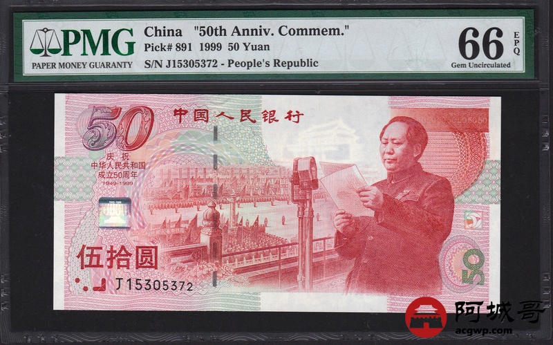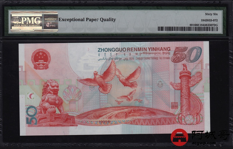 Lot:72 1999年 伍拾圆建国钞 中国人民银行 PMG 66 EPQ 好号无4
