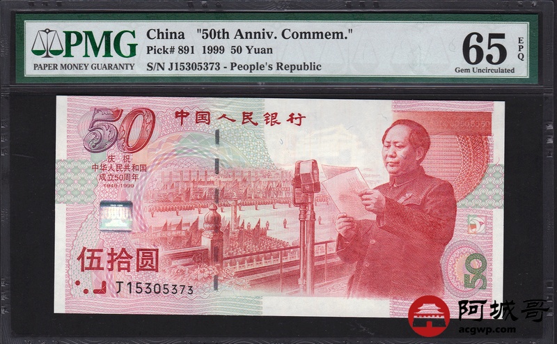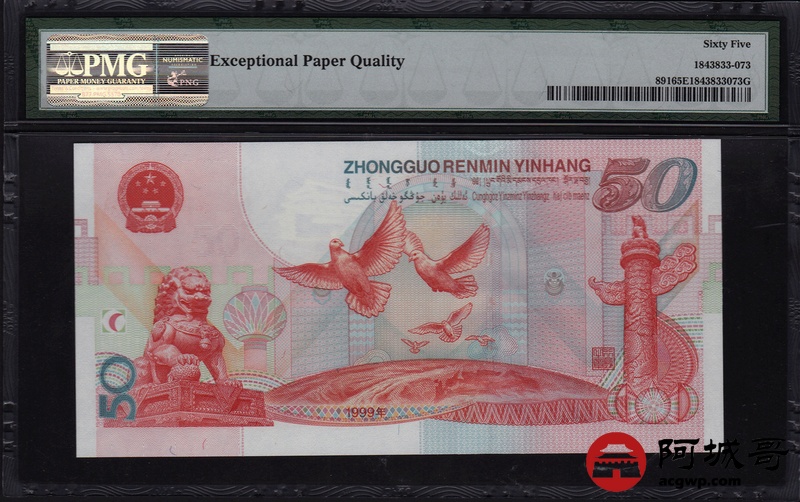 Lot:73 1999年 伍拾圆建国钞 中国人民银行 PMG 65 EPQ 好号无47