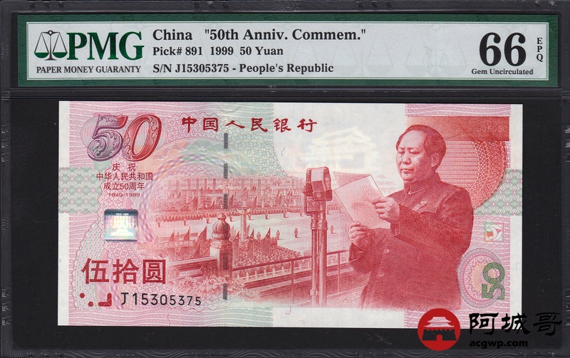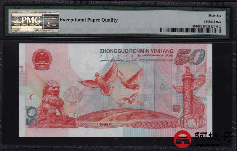 Lot:75 1999年 伍拾圆建国钞 中国人民银行 PMG 66 EPQ 好号无4