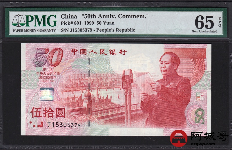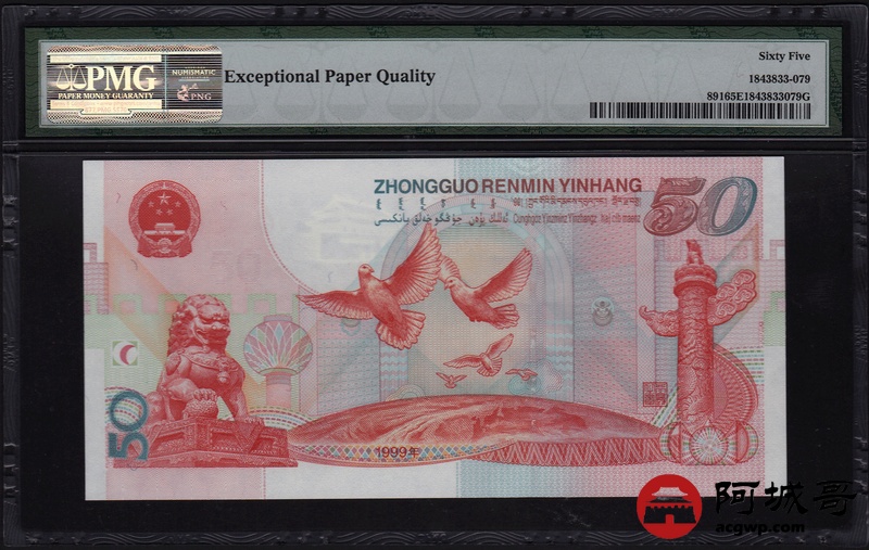 Lot:79 1999年 伍拾圆建国钞 中国人民银行 PMG 65 EPQ 好号无4