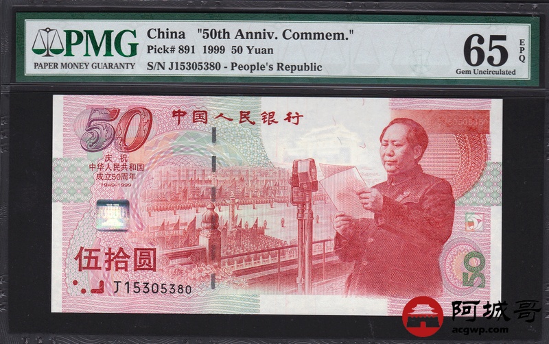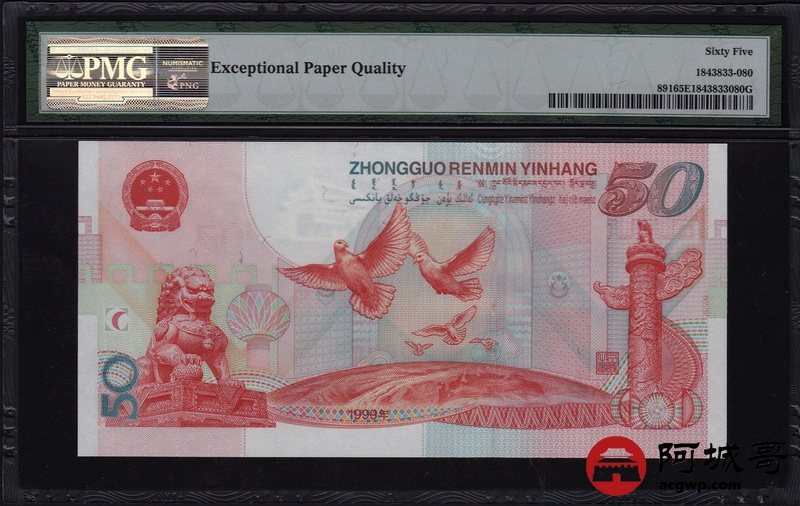 Lot:80 1999年 伍拾圆建国钞 中国人民银行 PMG 65EPQ 好号无47