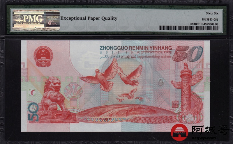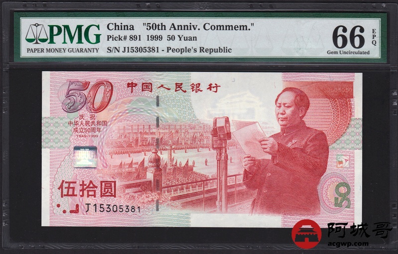 Lot:81 1999年 伍拾圆建国钞 中国人民银行 PMG 66 EPQ 好号无47