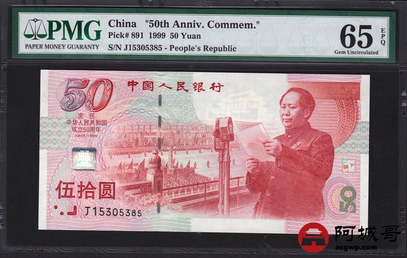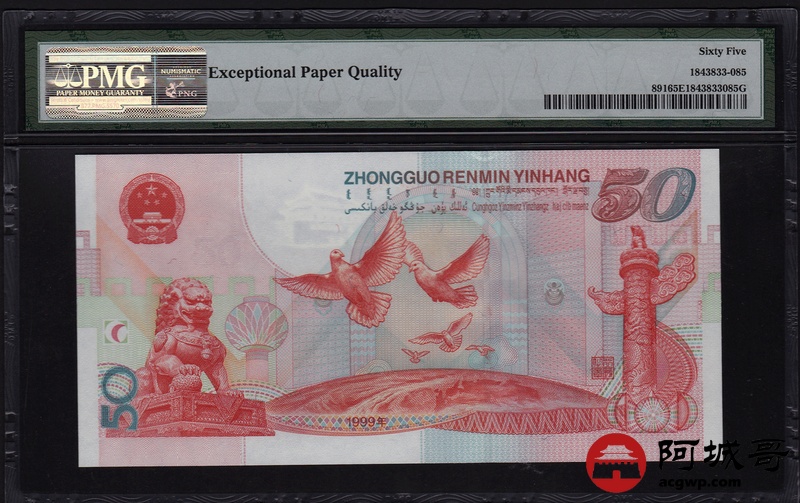 Lot:85 1999年 伍拾圆建国钞 中国人民银行 PMG 65 EPQ 好号无47