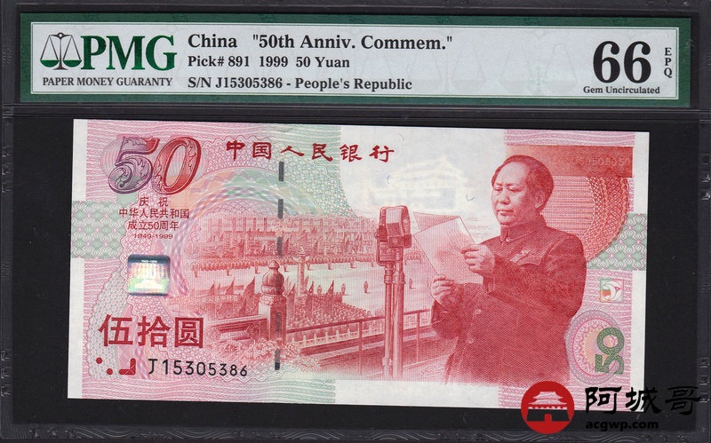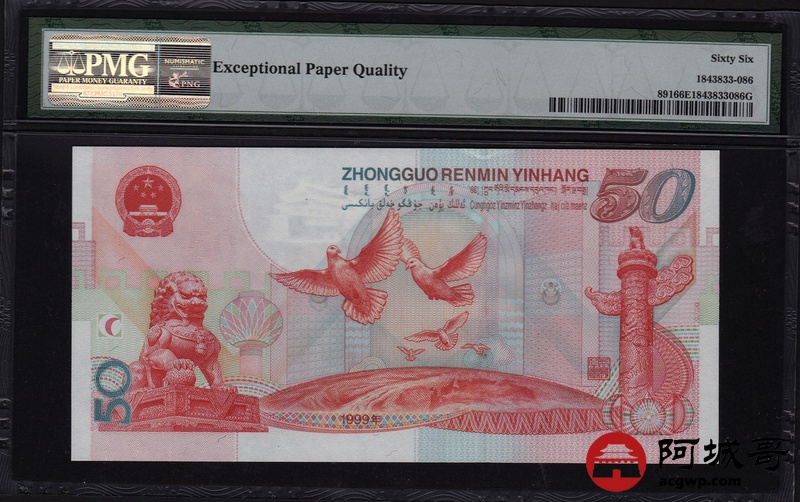 Lot:86 1999年 伍拾圆建国钞 中国人民银行 PMG 66 EPQ 好号无47