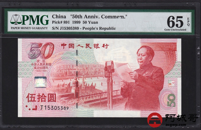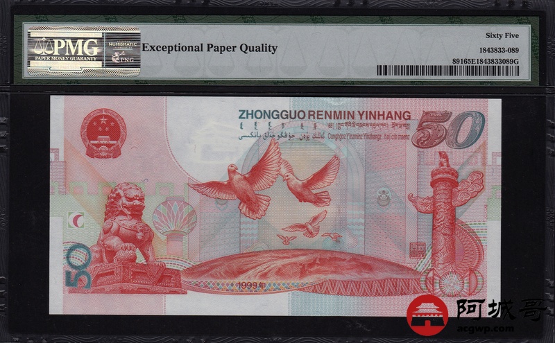 Lot:89 1999年 伍拾圆建国钞 中国人民银行 PMG 66 EPQ 好号无47