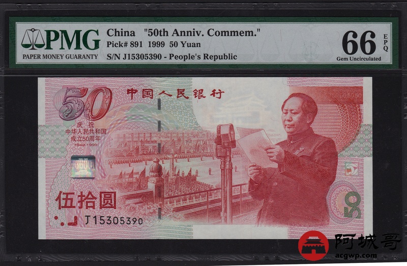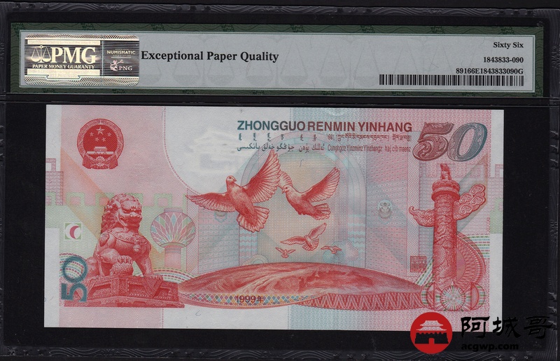 Lot:90 1999年 伍拾圆建国钞 中国人民银行 PMG 66 EPQ 好号无47