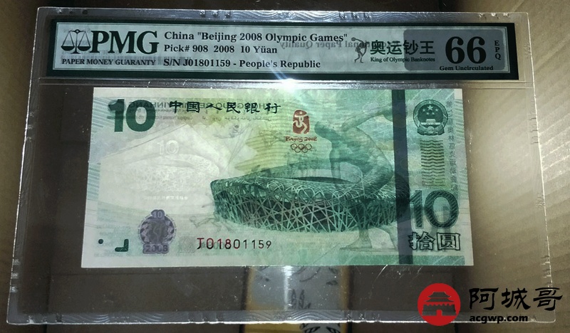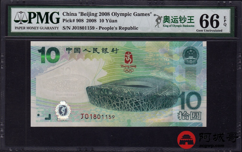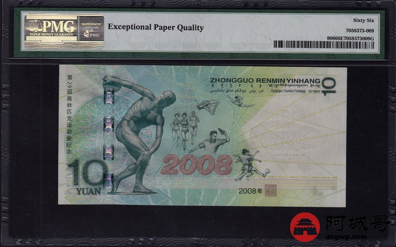 Lot:15 2008年 拾圆 奥运绿钞 中国人民银行 PMG 66 EPQ 好号无47