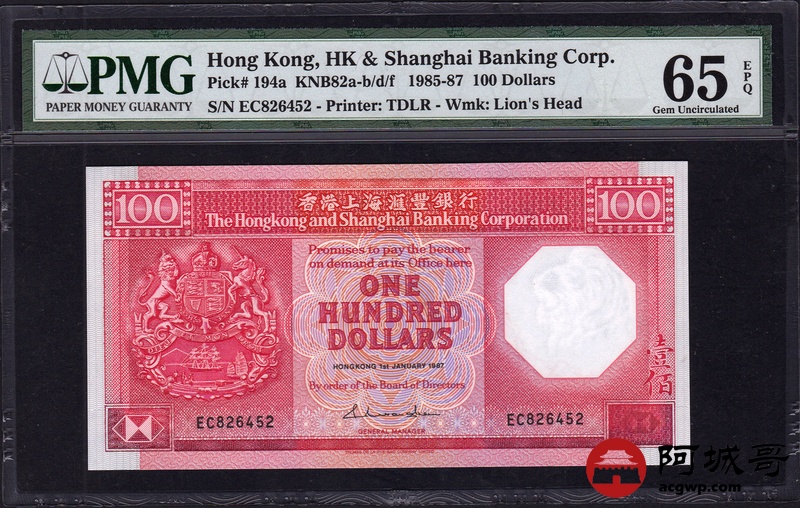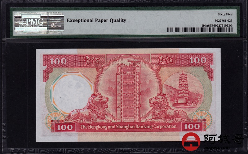 Lot:1 1985-87年 100元 香港上海汇丰银行 PMG 65 EPQ