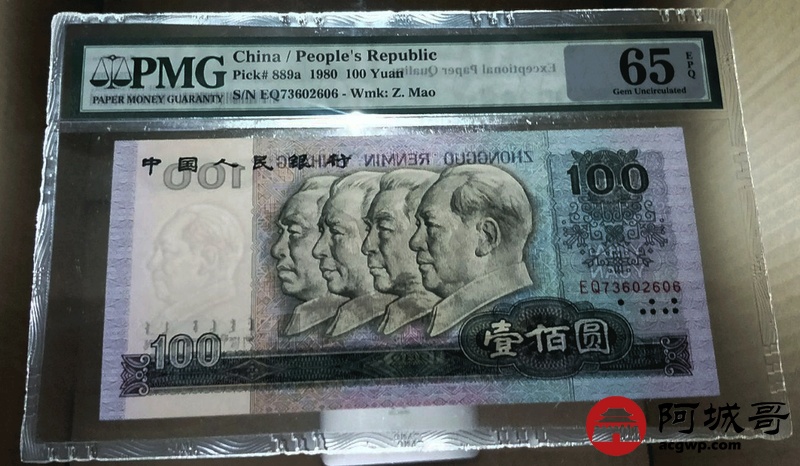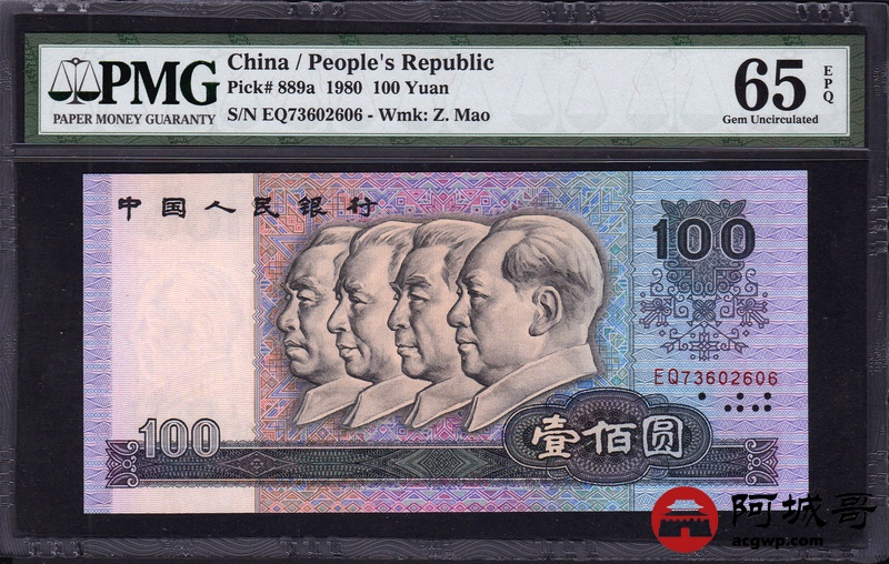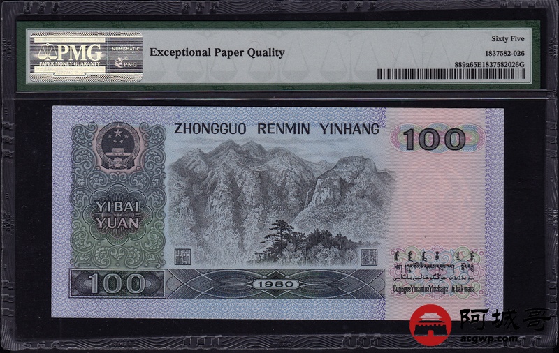 Lot:16 四版人民币 1980年 壹佰圆 中国人民银行 PMG 65 EPQ 好号无4