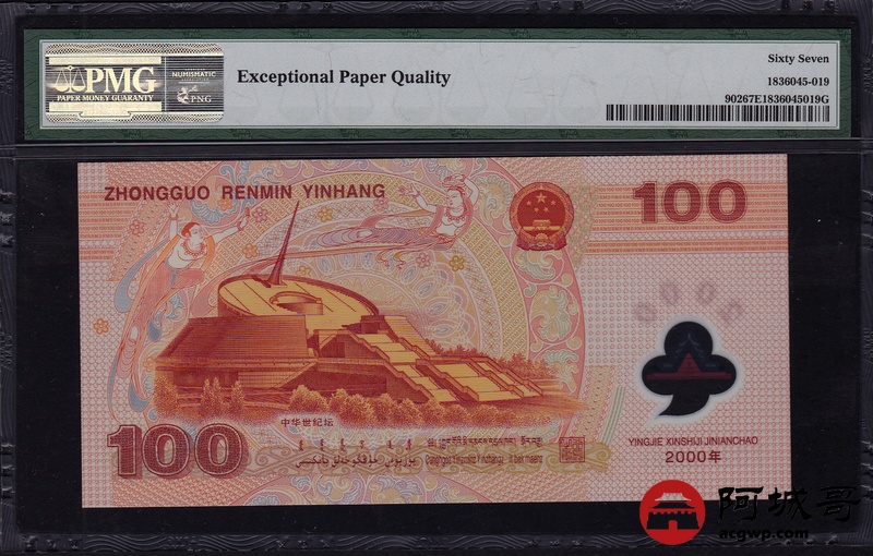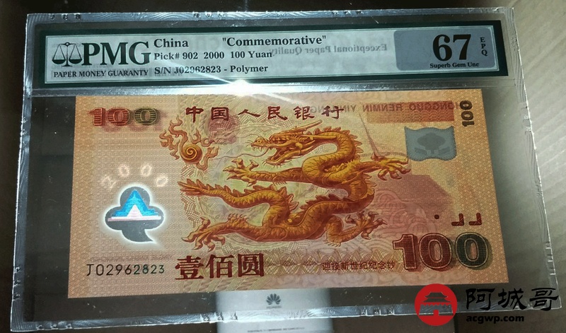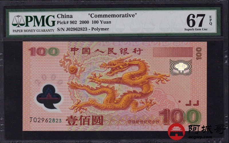 Lot:12 2000年 壹佰圆 龙钞 中国人民银行 PMG 67 EPQ 好号无47
