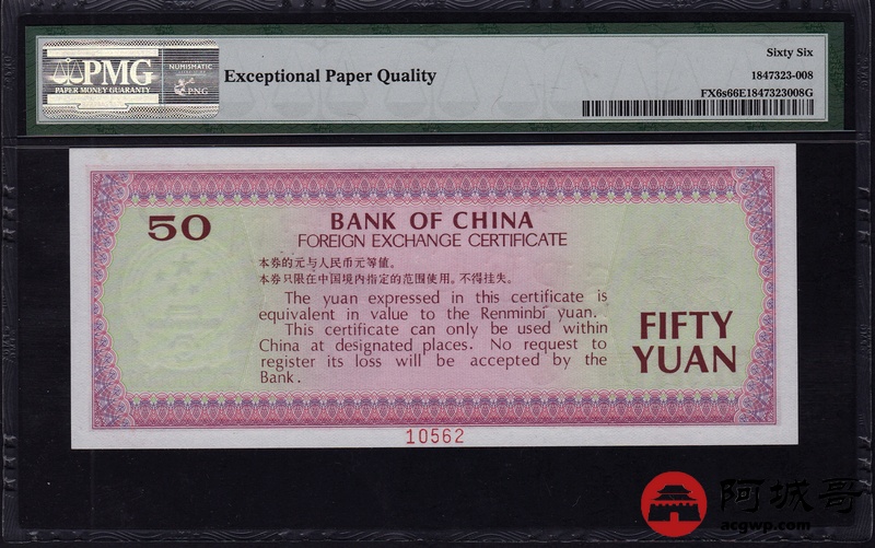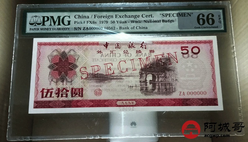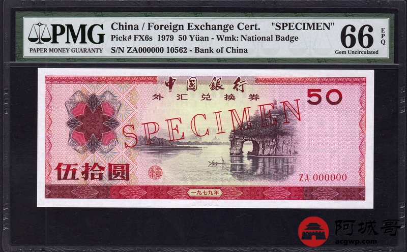Lot:29 一九七九年 伍拾圆 中国银行外汇兑换券 票样 PMG 66 EPQ