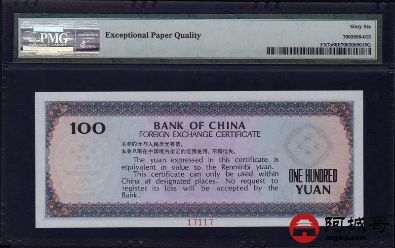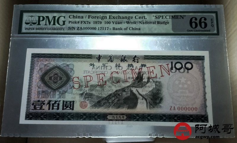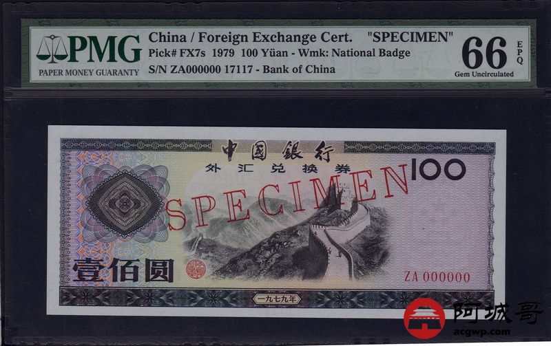 Lot:13 一九七九年 壹佰圆 票样 中国银行外汇兑换券 PMG 66 EPQ