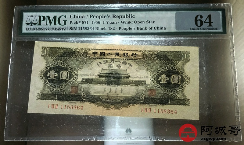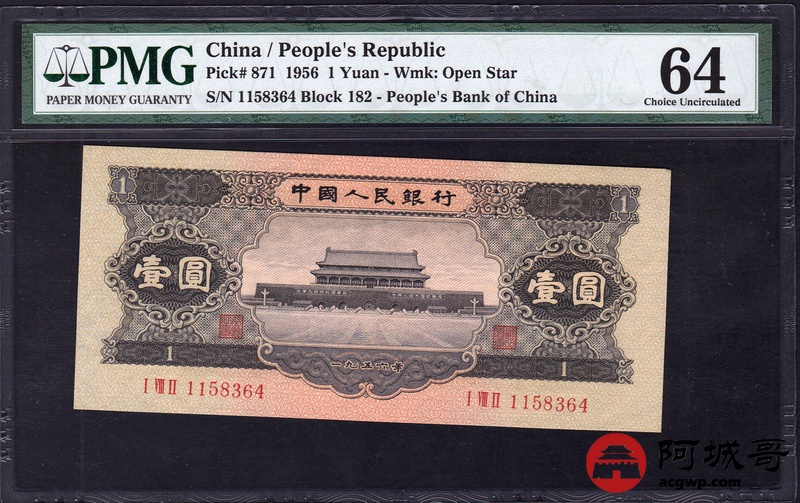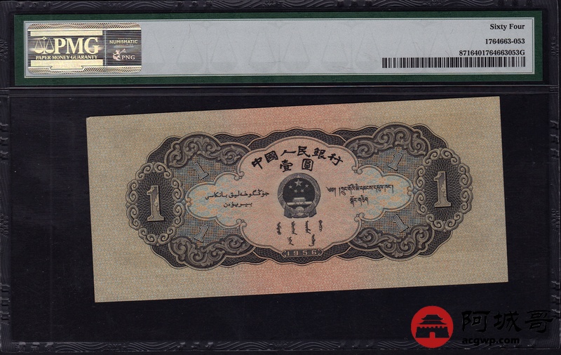 Lot:34 二版人民币 1956年 黑壹圆 中国人民银行 PMG 64