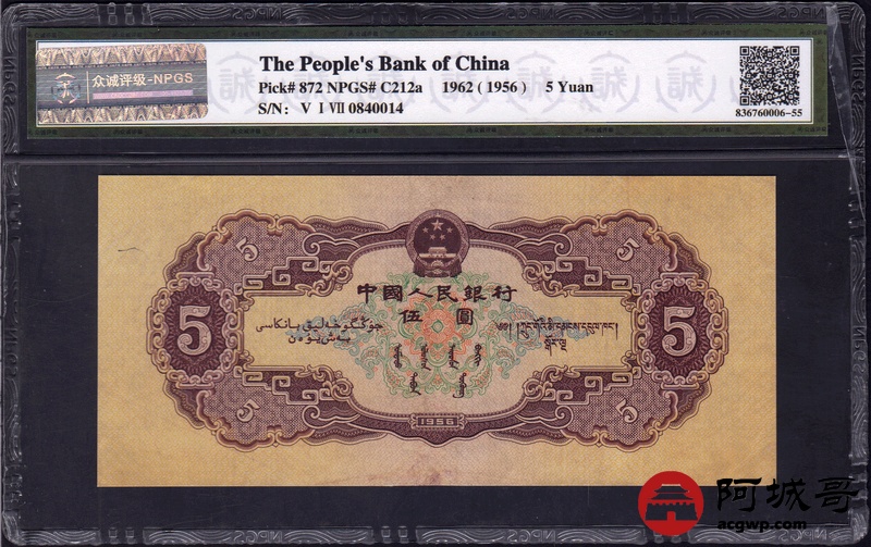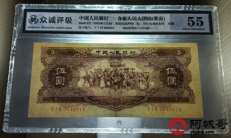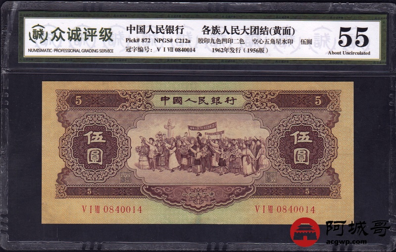 Lot:35 二版人民币 1956年 黄伍圆 星水印 中国人民银行 众诚评级 55
