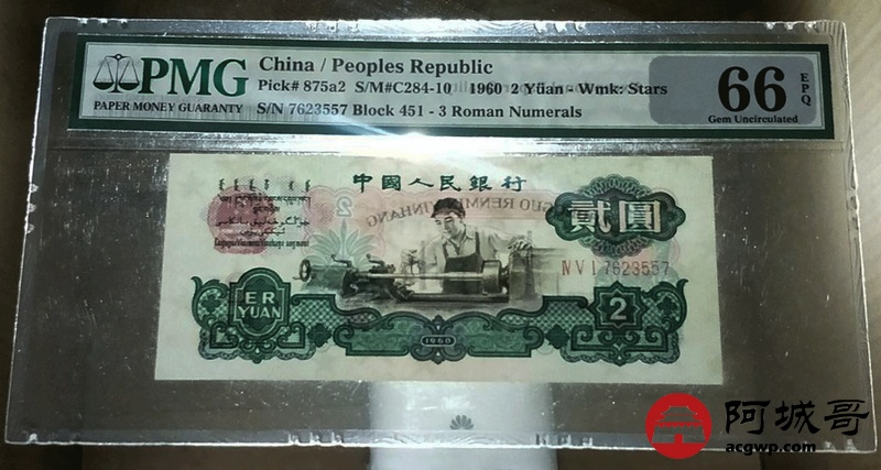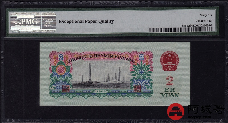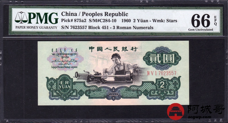 Lot:5 三版人民币 1960年 贰圆车工 五星水印 中国人民银行 PMG 66 EPQ 好号无4